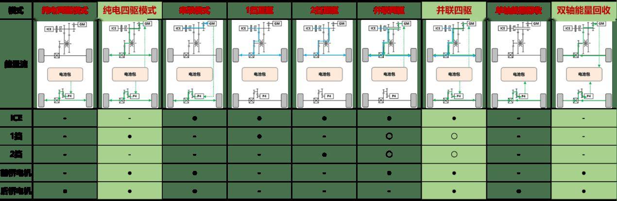 而在Hi4智能四驱电混技术中,H(Hybrid)代表混动,i(intelligent)代表智能,4代表(4WD)四驱系统。使用P2电机来取代传统布局中的P1+P3电机,并在后轴位置增加P4电机,可以依据工况实现纯电后驱、纯电四驱、串联后驱、1挡直驱、2挡直驱、并联两驱、并联四驱以及单轴或双轴能量回收等工作模式的智能切换。相比于以往混动系统集中于车辆前桥的构型,扩大了双电机串并联混动构型的使用场景。