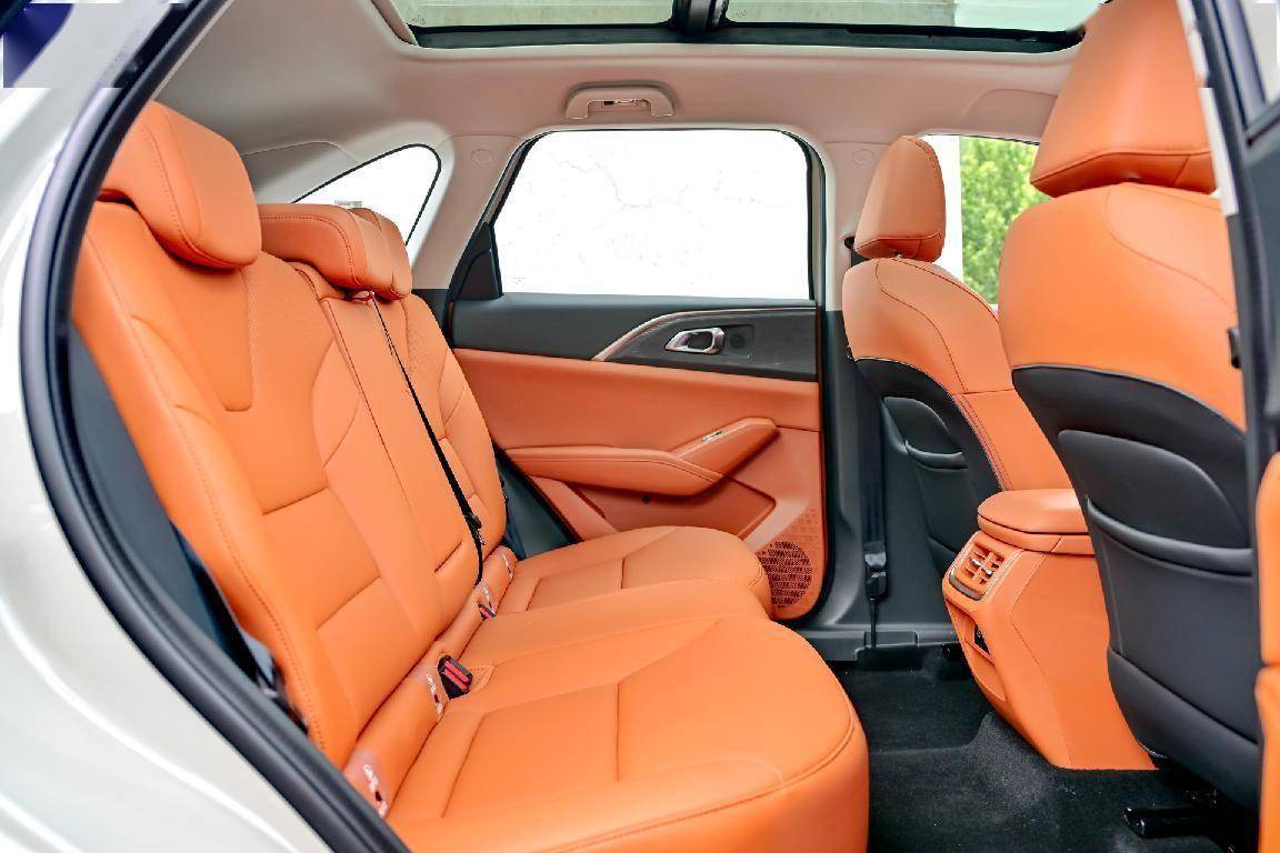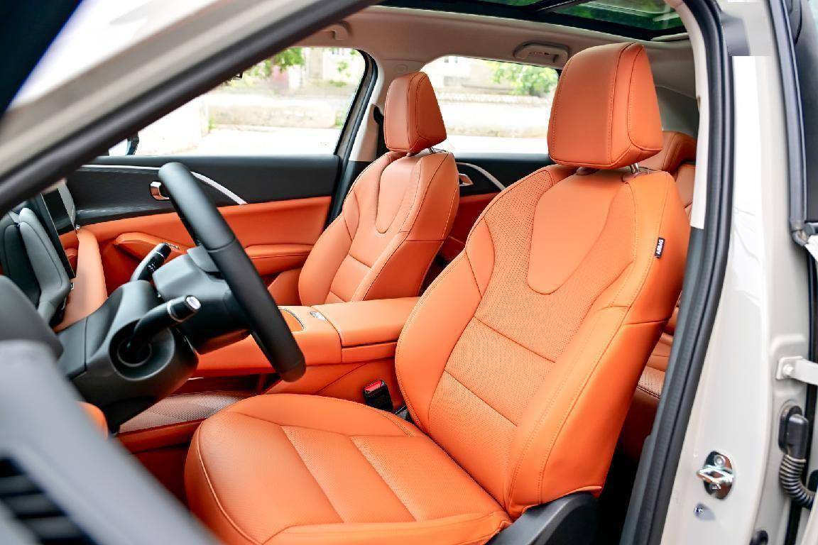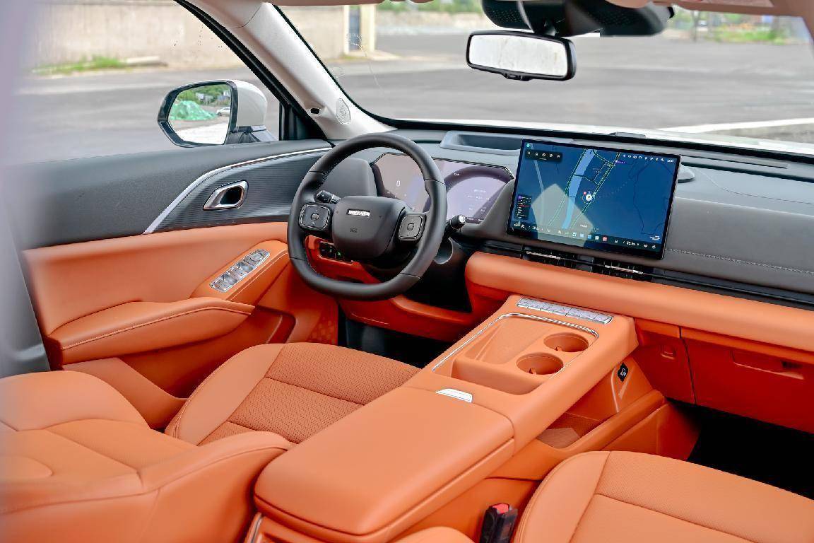 走进驾驶室,二代哈弗枭龙MAX提供天镜白、峡谷棕和探秘黑三种内饰颜色,本次驾驶的车型采用峡谷棕配色,整体设计既符合新能源汽车简洁的风格,也通过软性材质的包覆营造出了豪华质感。搭配12.3英寸全液晶仪表、14.6英寸中控屏,以及顶配车型搭配HUD抬头显示,各自承担专属的显示内容,让旅行成为一种享受。悬浮式中控台设计较为特别,左侧预留具有50W无线充电功能的手机放置区域,并且在下方设计有散热风扇,右侧为杯架,常用的空调等实体按键设计在上部,操作手感和布局设计合理。座椅运用双密度发泡工艺增添舒适感,主驾驶位支持12向电动调节,全系标配前排座椅加热,中高配车型前排座椅有通风,并可选装按摩功能。后排座椅为了保证舒适度,座椅靠背提供27度、32度两挡调节,折叠扶手、隐藏杯架、后排空调出风口等常见配置。