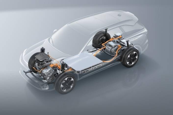 前驱动电机与两挡混动专用变速器组合,形成类似于P2的混动架构。前驱动电机采用Hair-pin扁线绕组技术,可输出功率70kW,传动效率达到98%。两挡变速器采用定轴轮系、轻量化设计,低谐波电机与高重合度轴齿组合实现全工况低噪音运转。后驱动电机同样采用了Hair-pin扁线绕组技术,并集成低拖曳减速器,总成工况效率≥88.6%,最大功率150kW,最大扭矩350Nm。